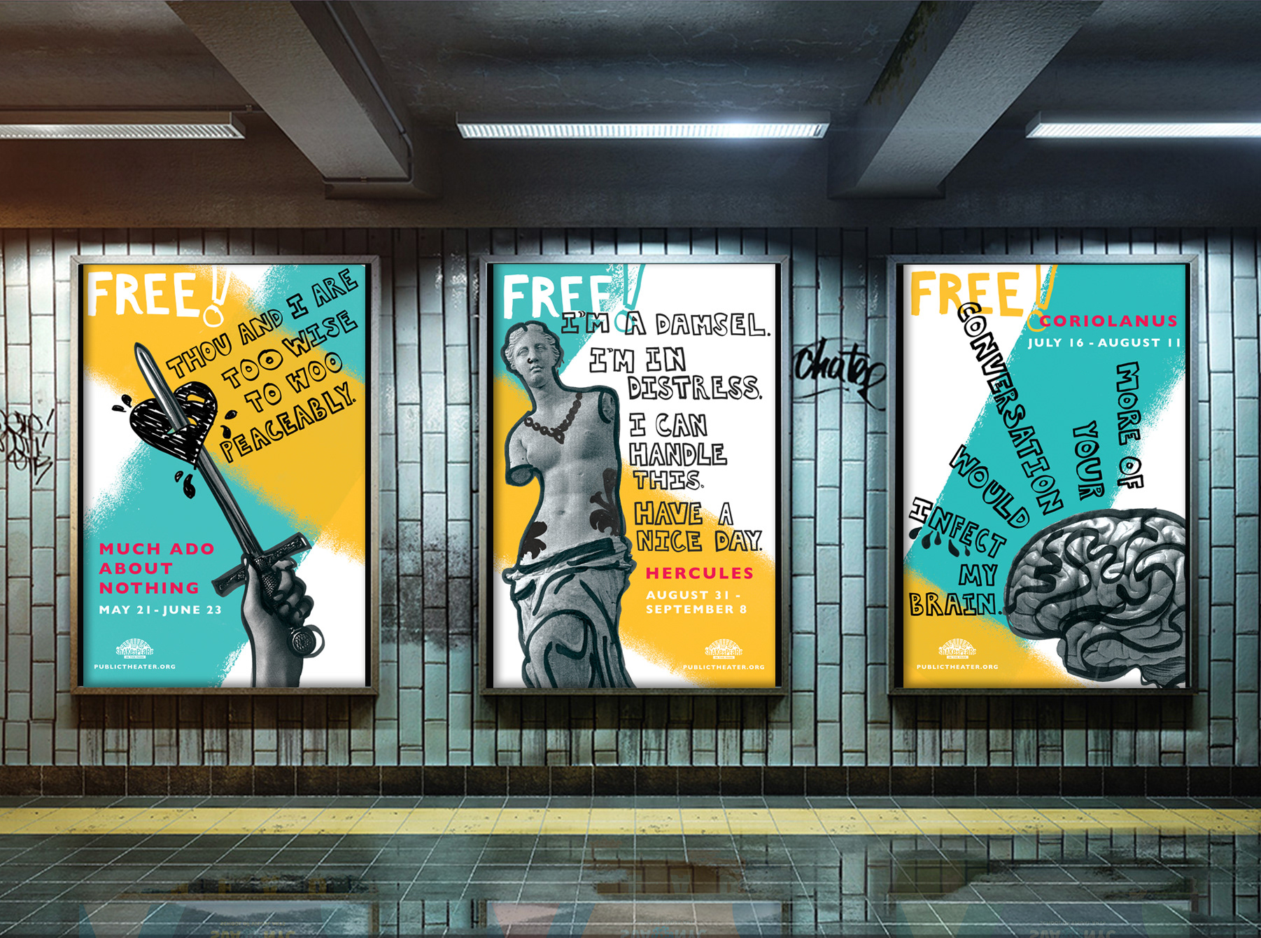 Three posters were created for the three plays produced in the Summer 2019 season. Handwritten text, hand-doodled and photocopied imagery, and rolled paint were used to add a renegade feeling to plays that many might consider stuffy, old, or boring—which Shakespeare most definitely is not.